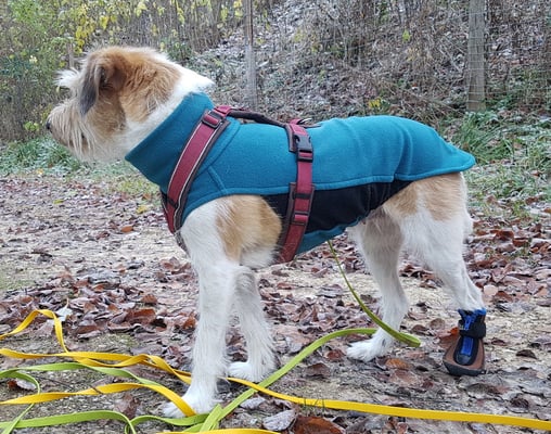Zur Schonung der Pfote hatte ich mir bereits einen Pfotenschuh besorgt, den wird Wurzel jetzt einige Zeit lang tragen müssen...
