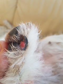 Da habe ich dann nochmal neu verbinden wollen und da war der obere Bereich der Kralle, das Horn, komplett drüber gelegen. Mein Tierarzt meinte, die Kralle muss raus...