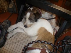 Nach dem Spaziergang im Lokal, Wurzels Hinterteil ist für Jule ein sanftes Ruhekissen.