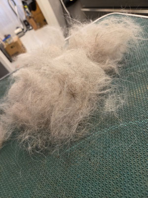 Askia kennt das Prozedere und ist ganz brav und sichtbar erleichtert... Einmal mehr offensichtlich: Trimmen verjüngt den Kromi enorm... das gezeigte Haar ist ca. die Hälfte von allem, was ich