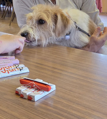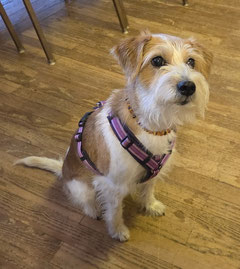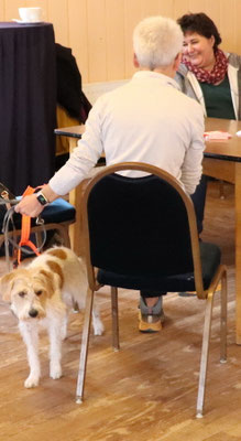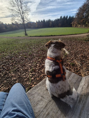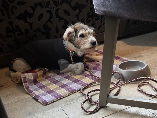 Die Spaziergänge halten wir kurz, nach der ersten Post OP Woche darf Askia auch kurz für einen Besuch mit ins Altersheim und auch für ein Mittagessen im Ramsach ist sie mit dabei. Wie immer, unauffällig, freudig und der Liebling aller...