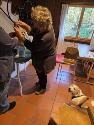 Besuch bei der Orthovet mit meinem Flüsilein, als Begleitung. Sie fiel die Treppe hoch und geht seither meistens lahm. Die Arzt Odyssee im Norden brachte keine Erkenntnisse, Dr. Blättler brauchte 20 Minuten.